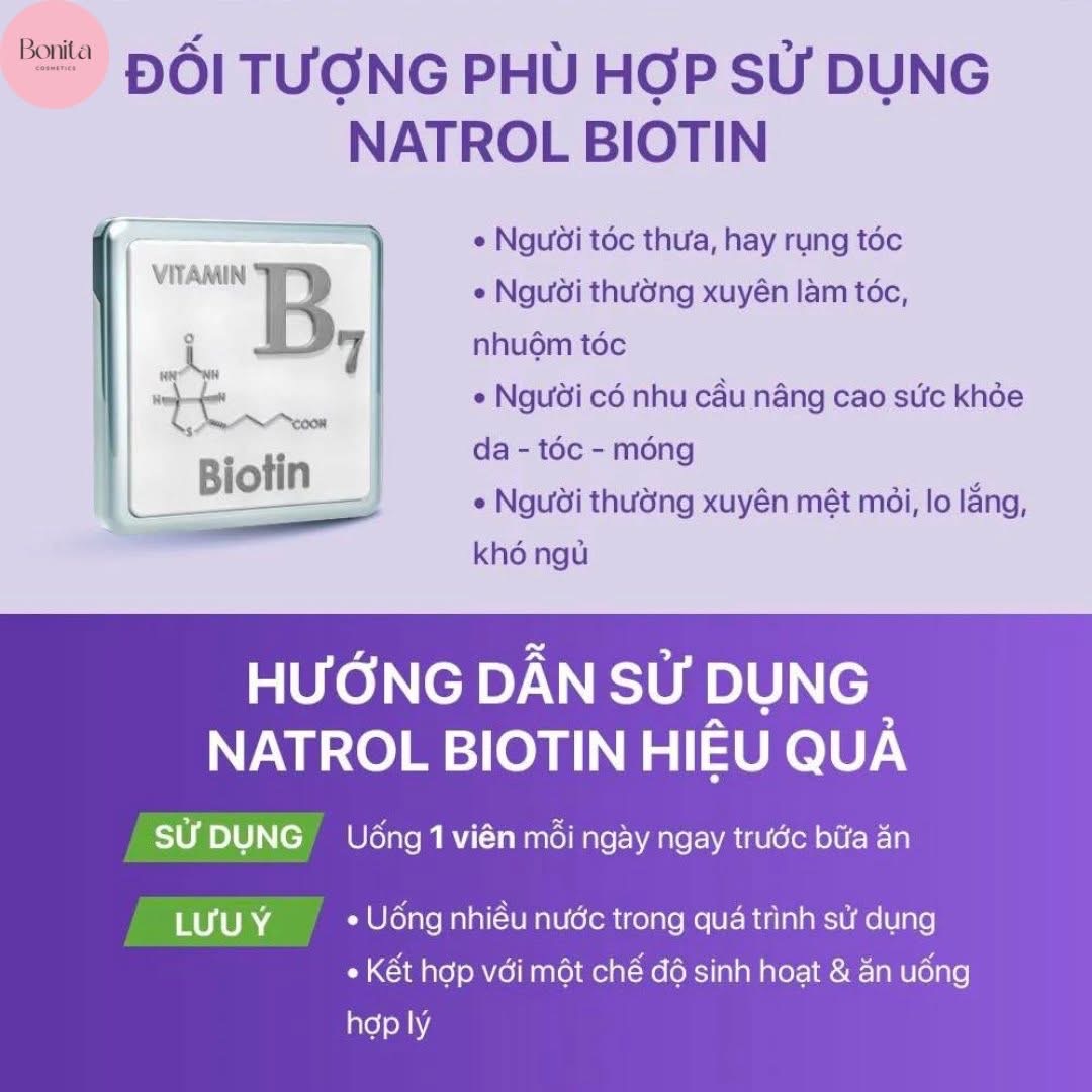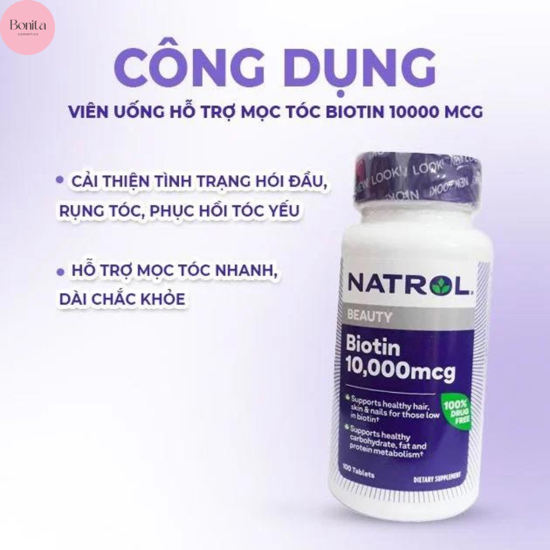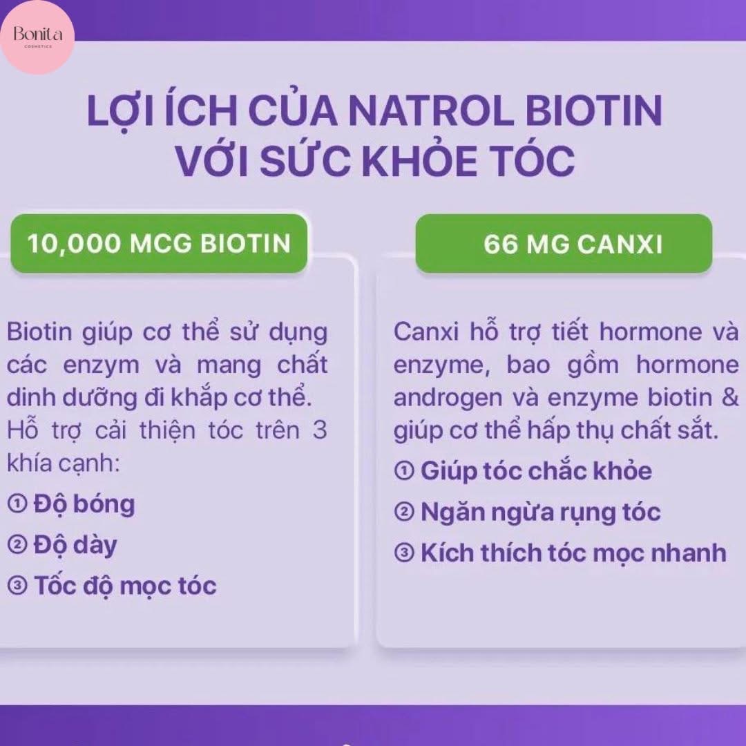 Viên uống mọc tóc Natrol Biotin 10,000mcg nổi bật với thành phần chính là Biotin và Canxi. Trong đó, Biotin đóng vai trò quan trọng đối với sức khỏe của tóc, da và móng tay của mỗi người. Việc bổ sung Biotin từ đường uống giúp bạn cải thiện tình trạng tóc, móng tay gãy rụng và yếu. Thêm vào đó, Canxi không những giúp tóc dày, khỏe mà còn hỗ trợ làm cứng móng tay, móng chân.