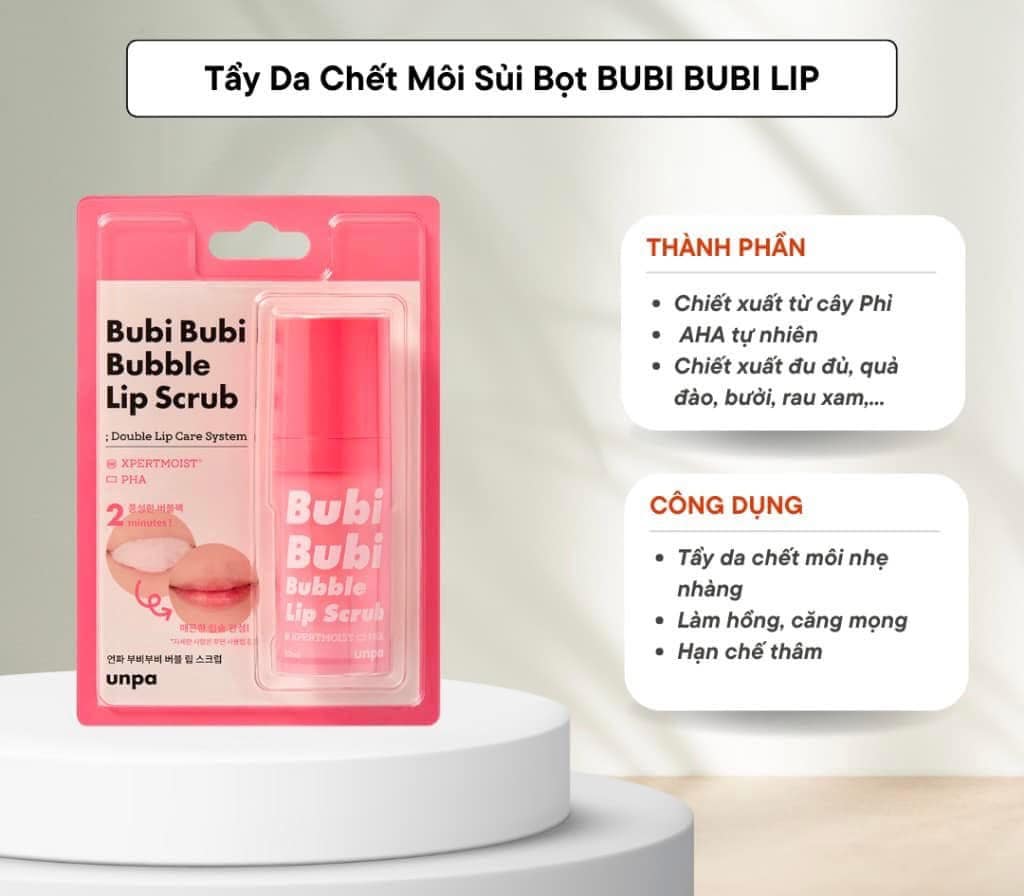 - Tẩy Tế Bào Chết Sủi Bọt Cho Môi Unpa Bubi Bubi Bubble Lip Scrub mang lại hiệu quả tối đa trong việc loại bỏ lớp tế bào da chết gây khô môi, giảm việc kích ứng cho môi mỏng manh nhạy cảm, đồng thời cấp ẩm cho môi với công thức mới mạnh mẽ hơn.