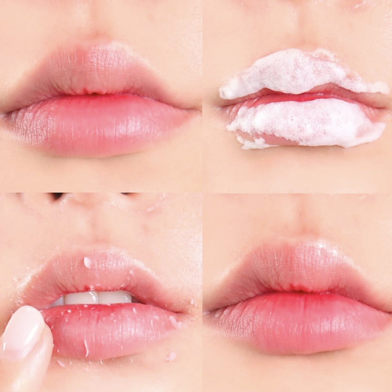 - Lớp bọt bắt đầu sủi bọt trên môi trong 3 phút, sau đó dùng ngón tay massage nhẹ nhàng trên môi để lớp da chết được bong ra hoàn toàn, sau đó dùng khăn lau sạch đi lớp tế bào chết trên môi.