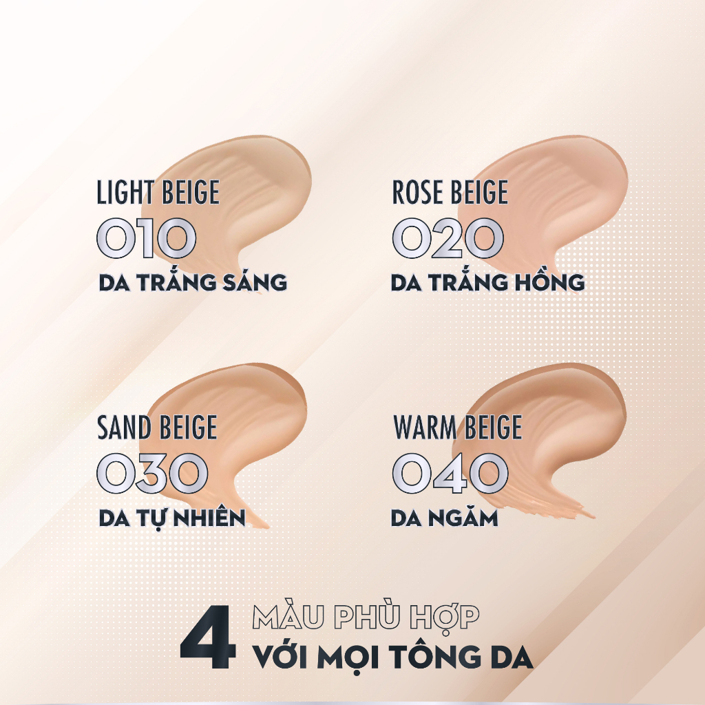 - 010: Light Beige dành cho làn da trắng sáng