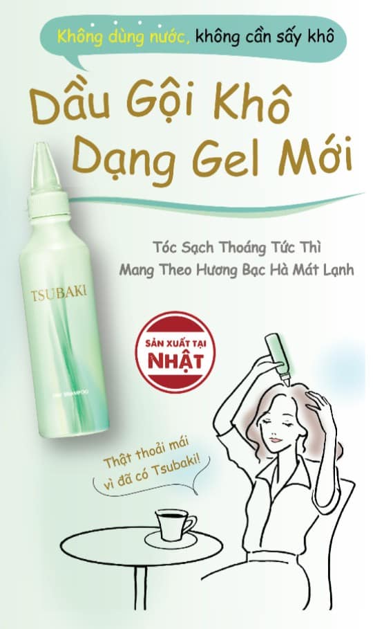 - Dầu Gội Khô Tsubaki Dry Shampoo chứa chiết xuất Bạc Hà, Trà Xanh kết hợp cùng 5 thành phần làm đẹp tự nhiên sẽ giúp nuôi dưỡng cho tóc chắc khỏe từ gốc đến ngọn.