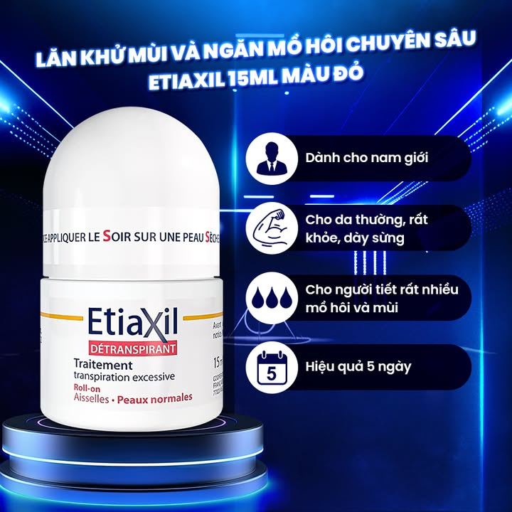 - EtiaXil Detranspirant Traitement Roll-On Peaux Normales – màu đỏ: Dành cho da khỏe, tiết nhiều mồ hôi – phù hợp nam giới