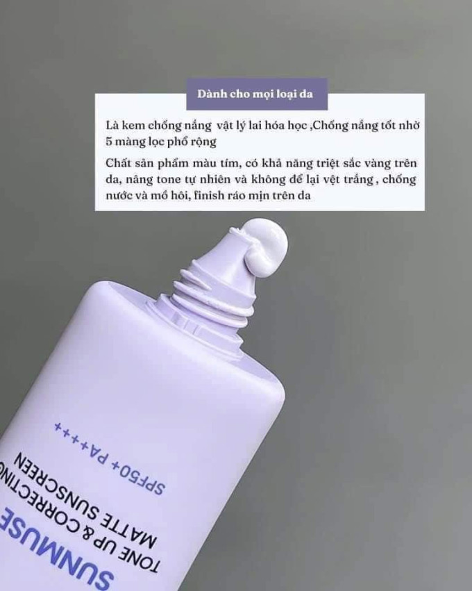 - Nâng tone tự nhiên: Với sắc tím nhẹ, kem chống nắng giúp trung hòa tông màu vàng trên da, mang lại làn da sáng hồng tự nhiên.