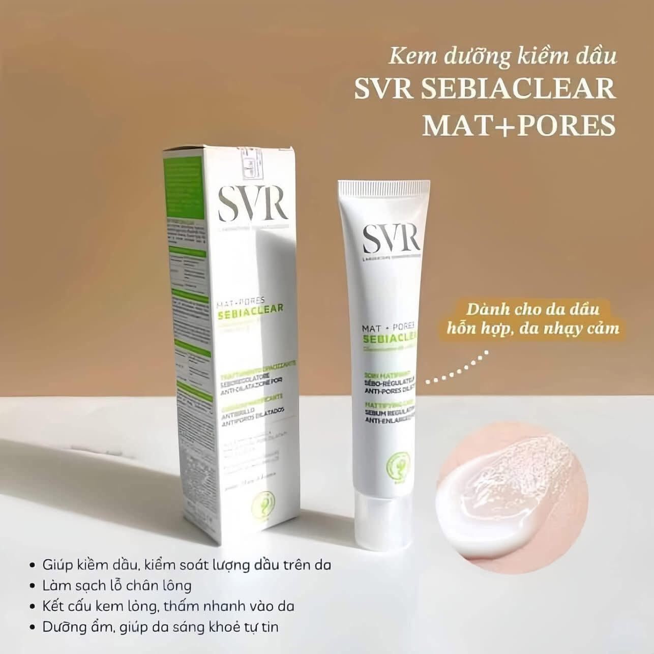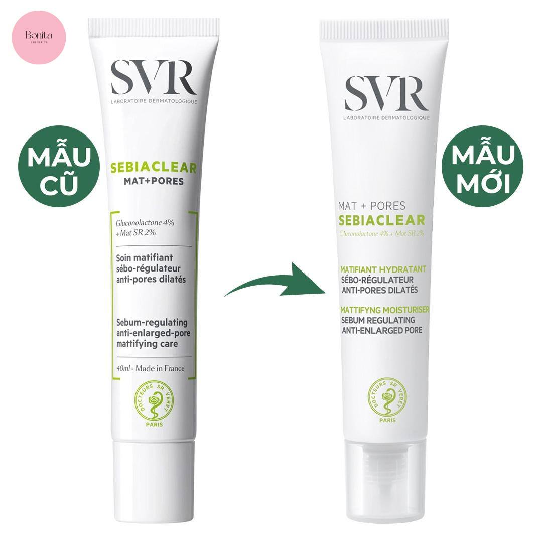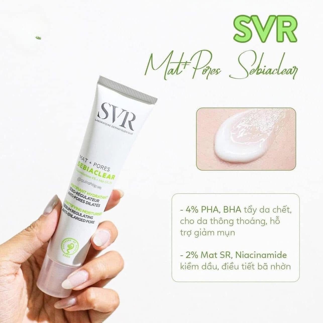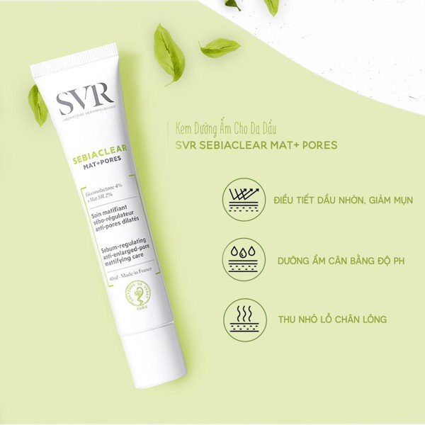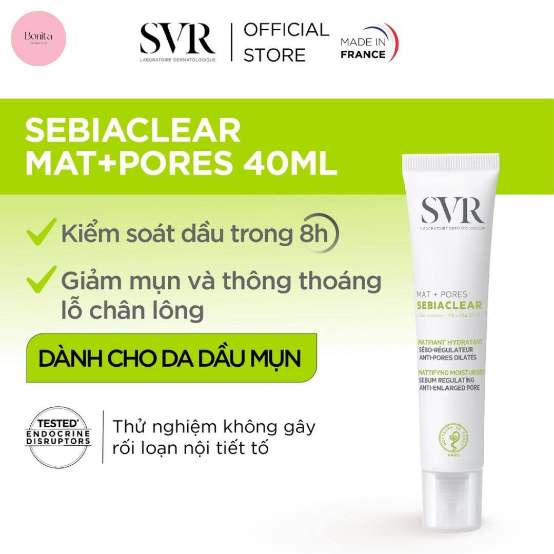 Kem Dưỡng Dưỡng Da Giảm Mụn Thông Thoáng Lỗ Chân Lông Và Dầu Nhờn SVR Sebiaclear Mat + Pores 40ml giúp điều tiết bã nhờn, giảm mụn, trị thâm, thu nhỏ lỗ chân lông và dưỡng ẩm da hiệu quả lên tới 72h.