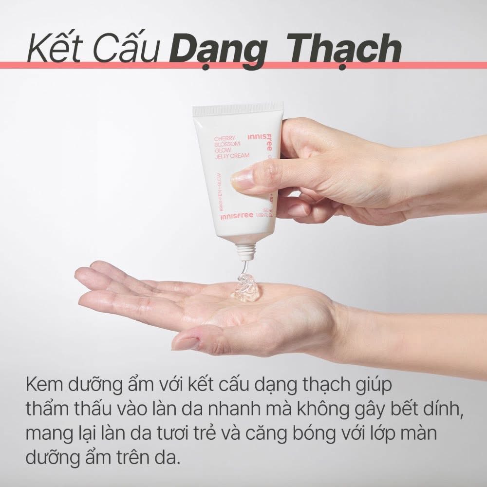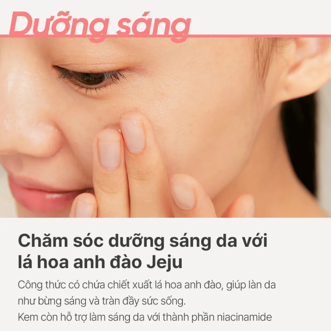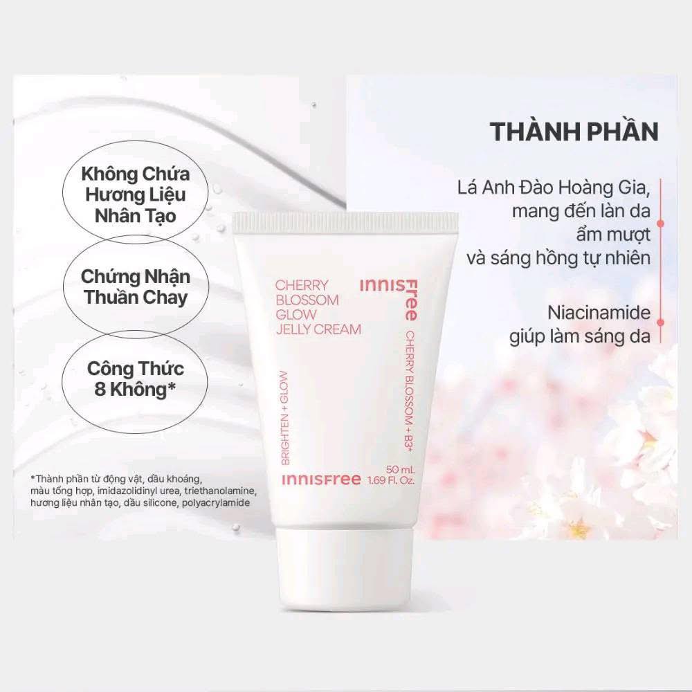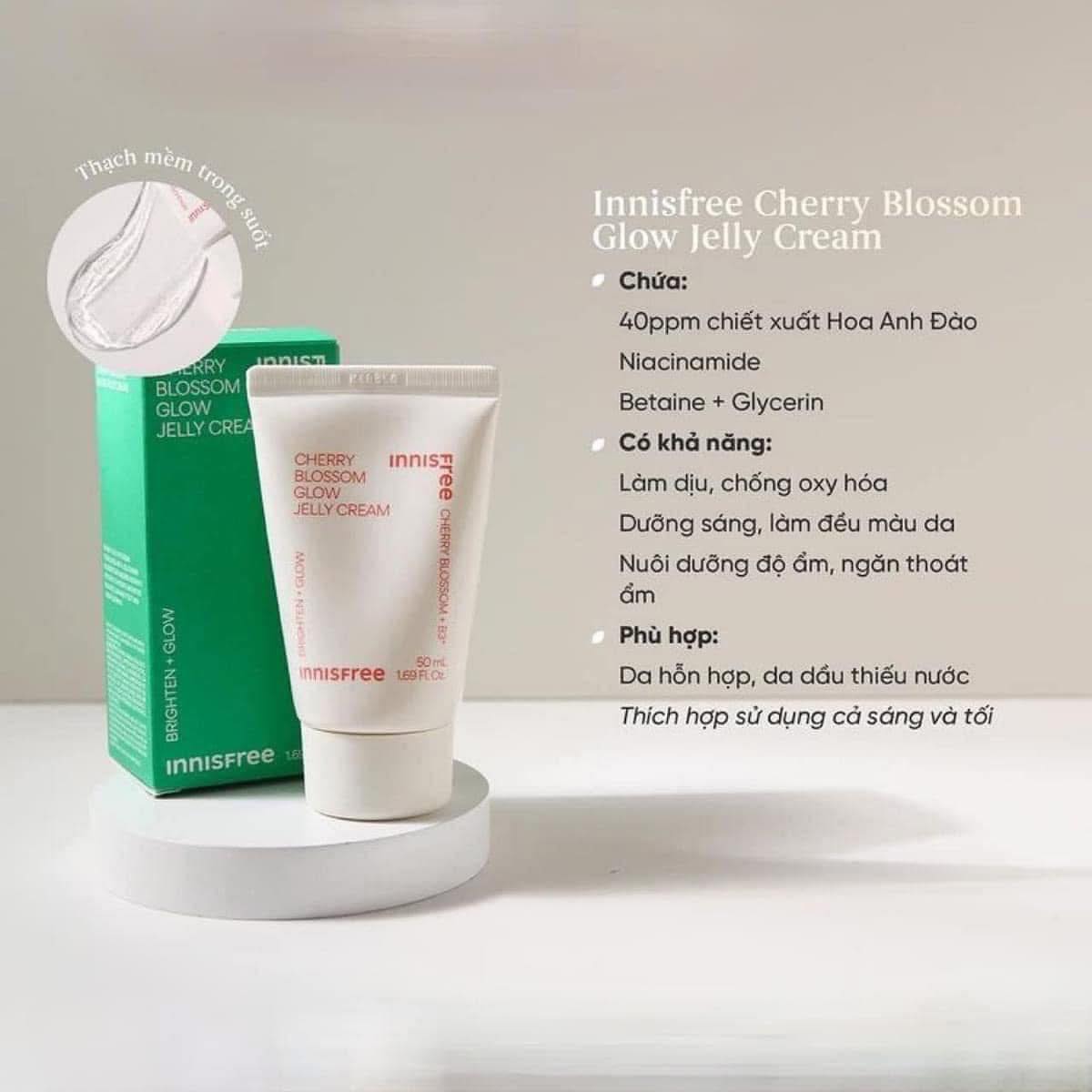 Kem Dưỡng Sáng Da Innisfree Jeju Cherry Blossom Jelly Cream được chiết xuất chính từ lá hoa anh đào hoàng gia từ đảo Jeju với hàm lượng 40 ppm có tác dụng “tưới mát” và “refresh” để khuôn mặt bạn trở nên sáng bừng sức sống. Trong lá hoa anh đào chứa rất nhiều các dưỡng chất hữu cơ, vitamin tổng hợp tốt cho da. Lá hoa anh đào chứa các đặc tính chống oxy hóa và chống viêm, có khả năng làm dịu da bị kích ứng. Hỗ trợ dưỡng da trắng hồng rạng rỡ, làm đều màu da và làm sáng các đốm đen trên da. Mang đến cho làn da bạn hiệu ứng trắng hồng tươi tắn, vô cùng rạng rỡ.