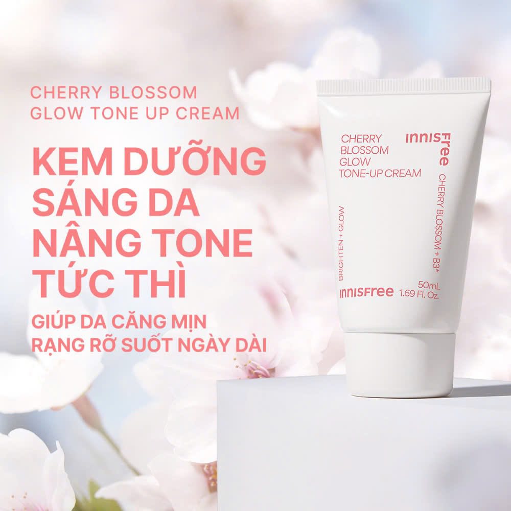 Innisfree Jeju Cherry Blossom Glow Tone-up Cream 50ml là dòng kem dưỡng 3 tác động: Hỗ trợ dưỡng trắng da – Nâng tone màu da – Làm đồng đều màu da cải thiện rõ rệt chỉ sau 4 tuần sử dụng.