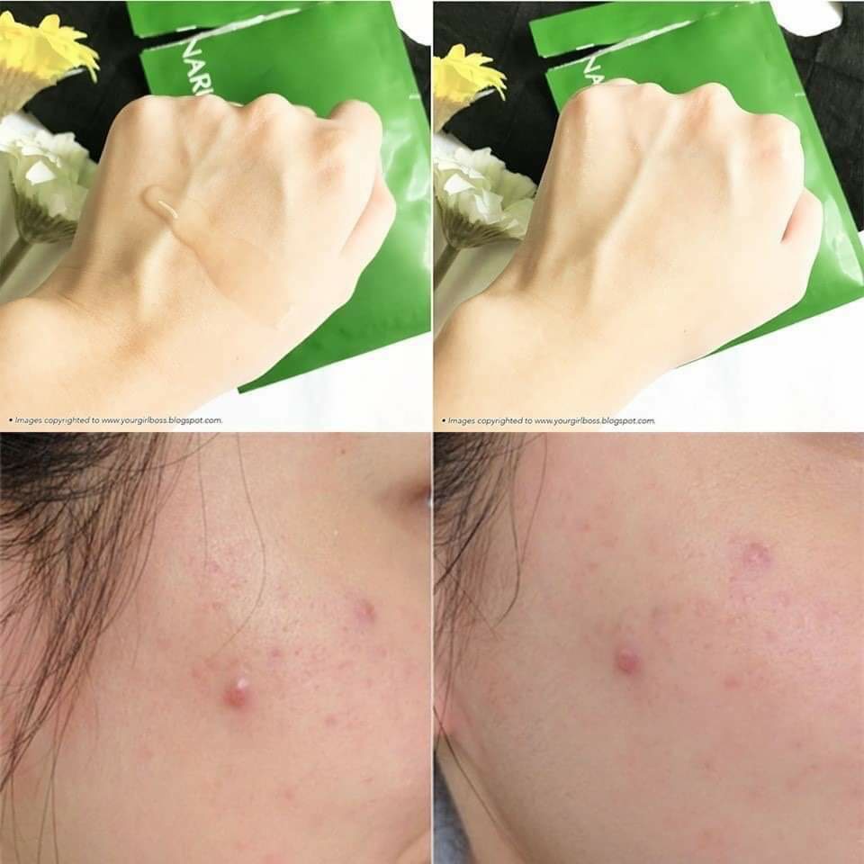– Chất mask cũng vì thế mà có hơi dày 1 chút xíu, nhưng mask vẫn ôm khít vào gương mặt. Sau khi đắp mask, bạn có thể thấy các vết mụn sưng tấy, mẩn đỏ được giảm bớt. Làn da vì được cấp nước nên cũng căng mịn, lỗ chân lông thu nhỏ lại, tình trạng đổ dầu trên da cũng được cải thiện.