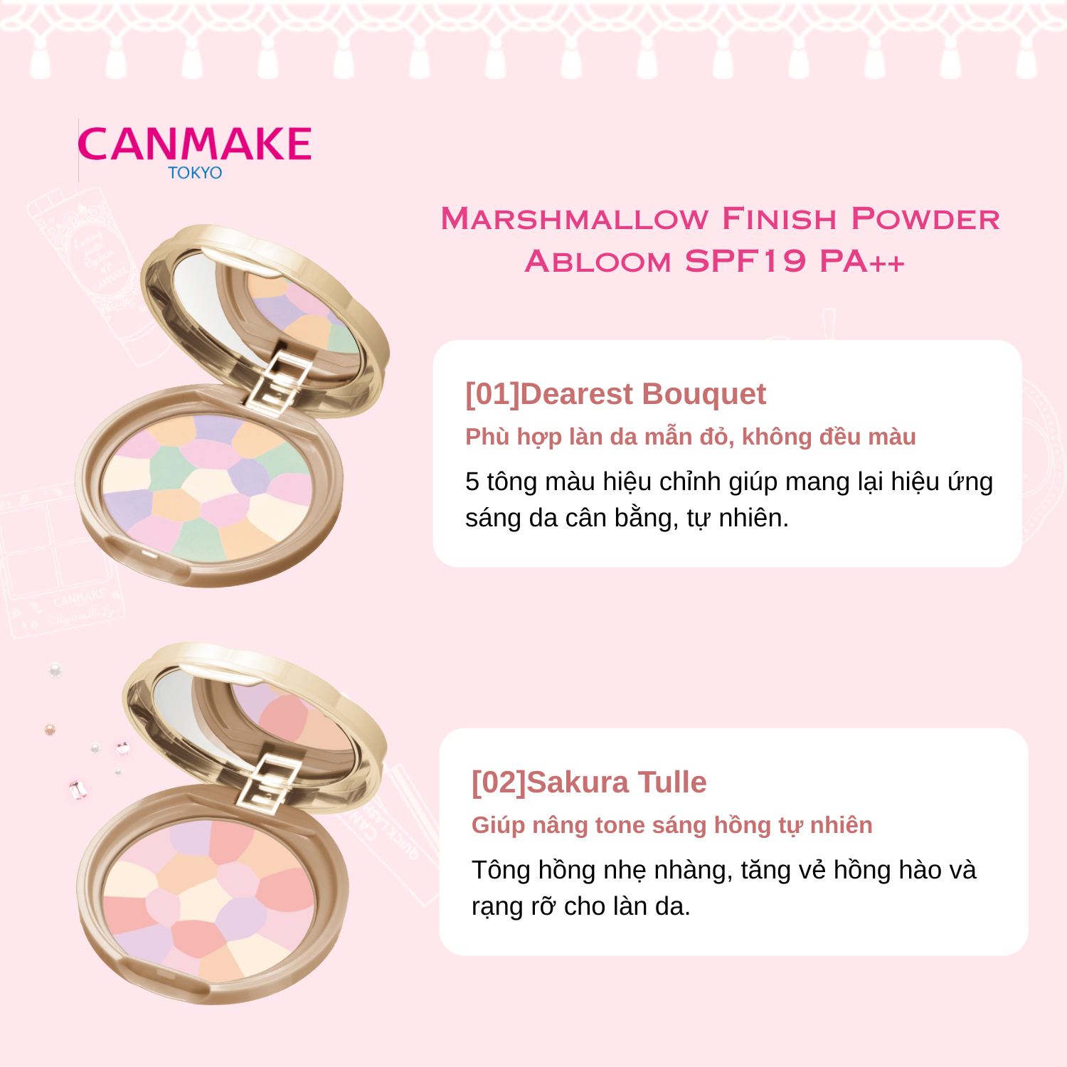 Phấn Phủ Đa Sắc Dạng Nén Canmake Marshmallow Finish Powder Abloom SPF19 PA++ là phấn phủ chứa 5 sắc thái được thiết kế cho hiệu ứng điều chỉnh tone da đều màu, giúp da bạn trông sáng hơn, tươi tắn cả ngày.