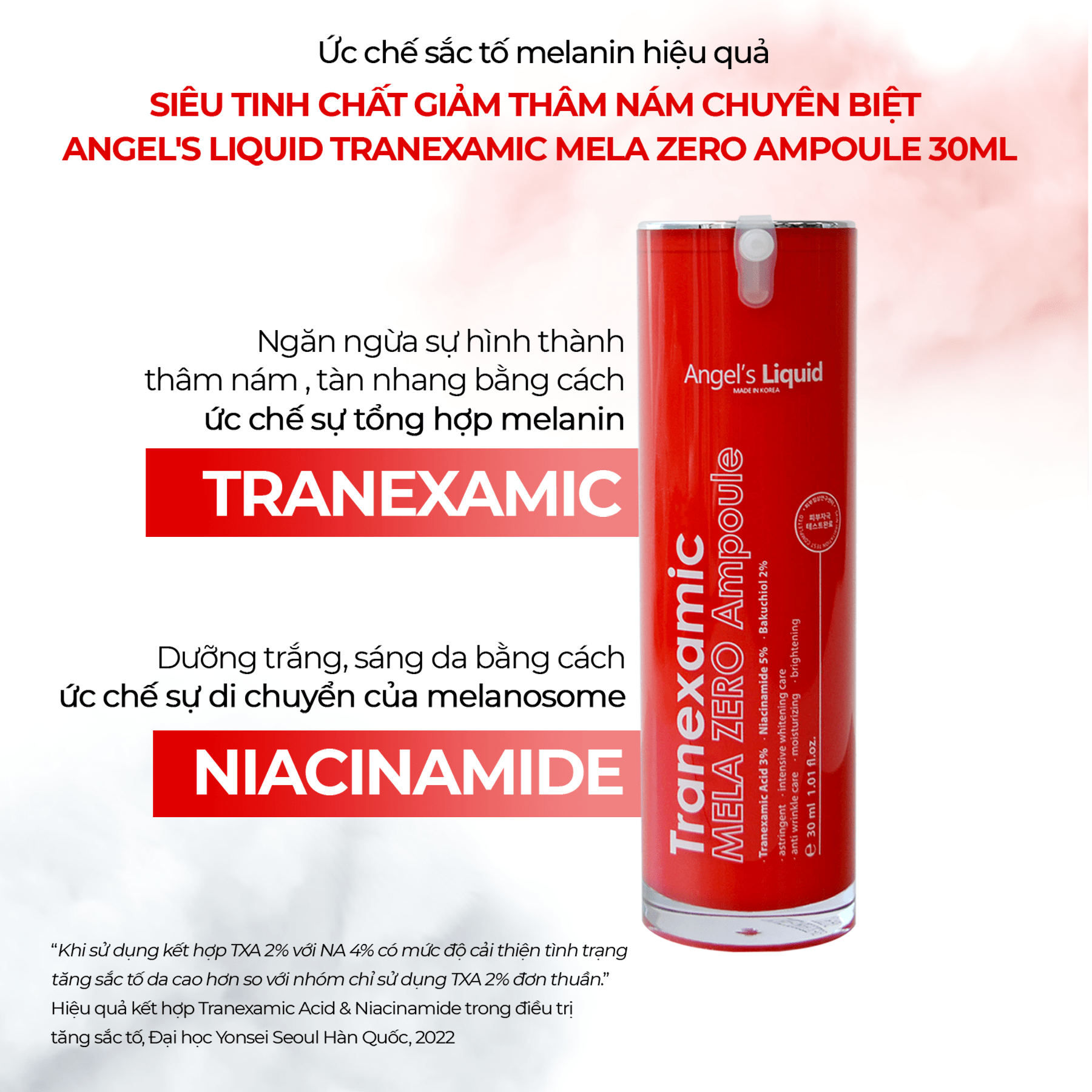 - 5% Niacinamide: cũng đã được nghiên cứu khi kết hợp chung với Tranexamic Acid sẽ làm tăng hiệu quả mờ thâm, sạm, nám một cách rõ rệt với cơ chế ngăn chặn sự chuyển hoá hắc sắc tố lên trên bề mặt da, đồng thời, giúp cải thiện sức khỏe, tăng cường hàng rào bảo vệ da.