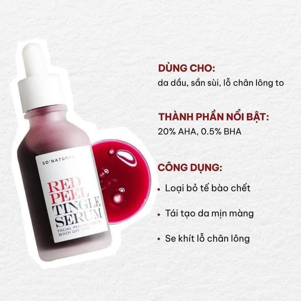Serum So’Natural Tái Tạo Da Sinh Học, Mờ Thâm Sáng Da 35ml là sản phẩm serum tẩy tế bào chết hoá học dành cho da mặt không gây bong tróc đến từ thương hiệu So’Natural của Hàn Quốc. Với sự kết hợp của 20% AHA, 0.5% BHA và các hoạt chất dưỡng ẩm, làm dịu da, Red Peel Tingle Serum giúp nhẹ nhàng lấy đi lớp tế bào sừng, làm thông thoáng lỗ chân lông, kiểm soát tình trạng mụn, dưỡng da căng mịn và đều màu, đem lại làn da tươi mới và mịn màng hơn.