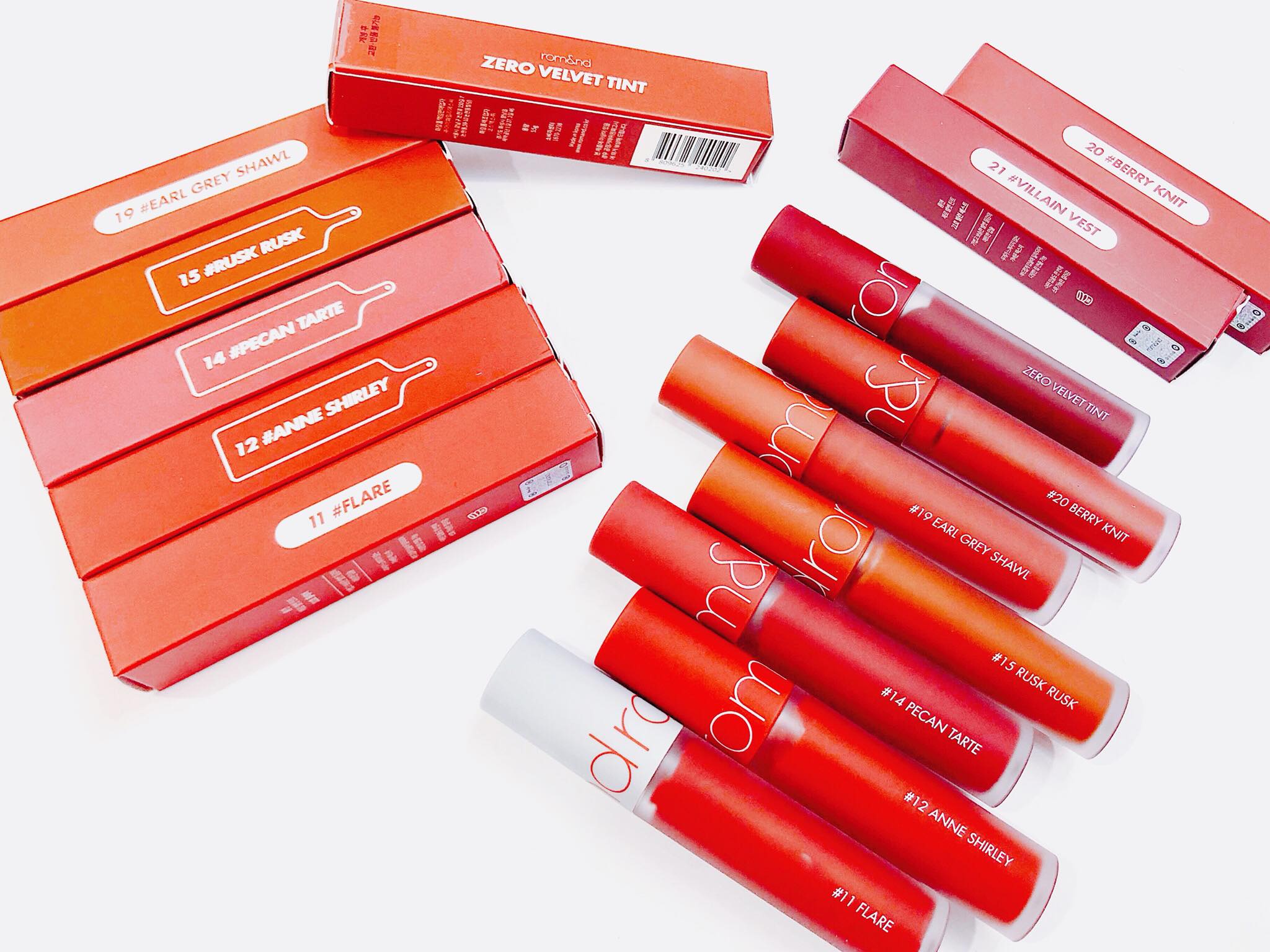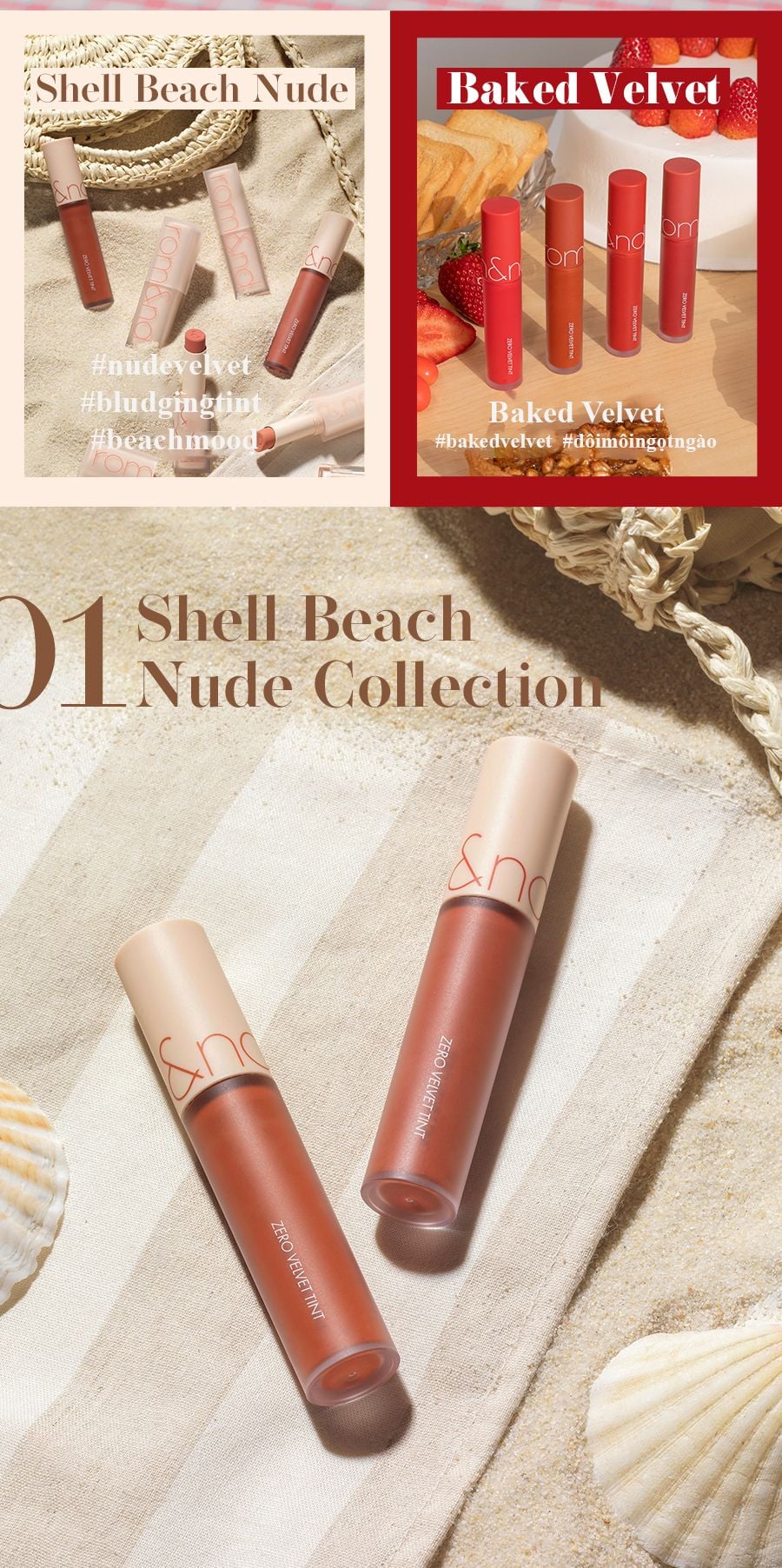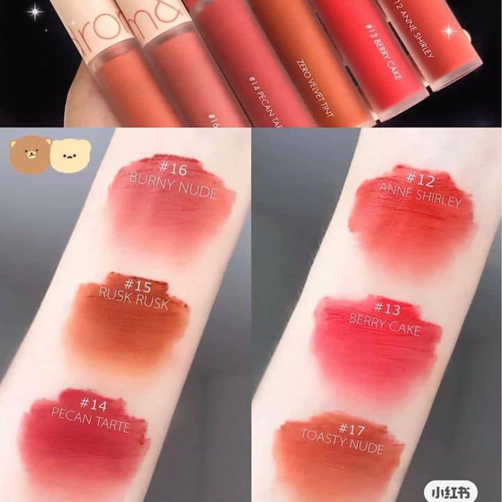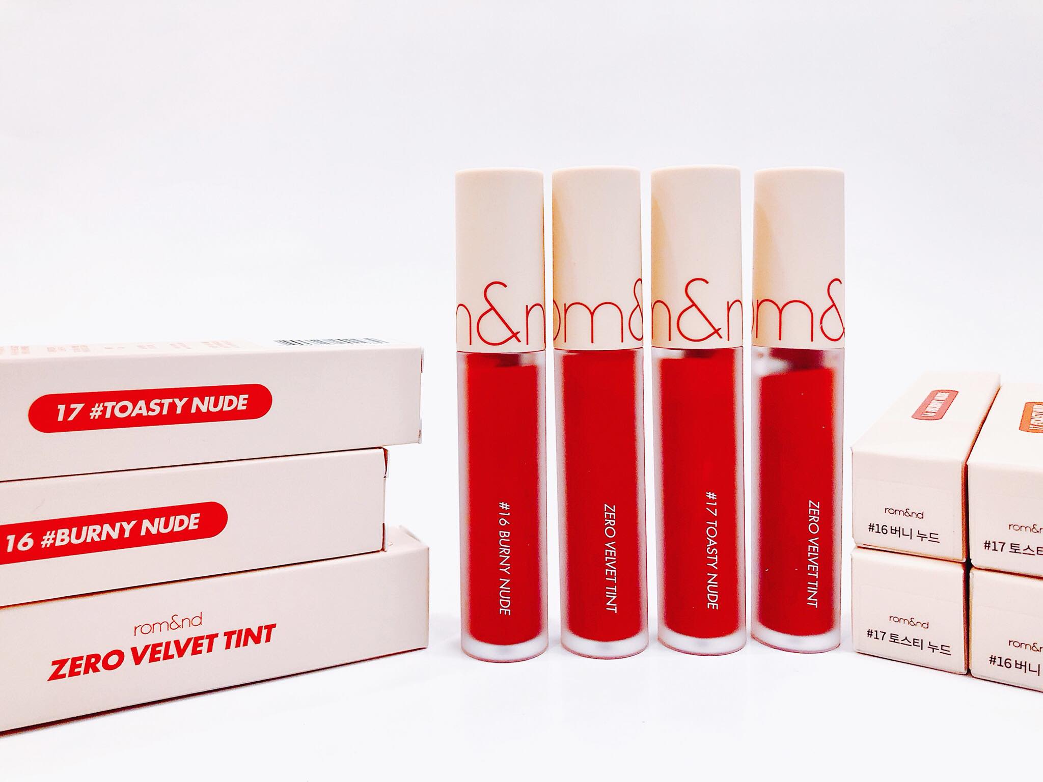 Romand Zero Velvet Tint phiên bản mới gồm 6 màu bổ sung, chia thành 2 bộ sưu tập là Baked Velvet với các son tone đỏ và Shell Beach Nude với các son tone nude.