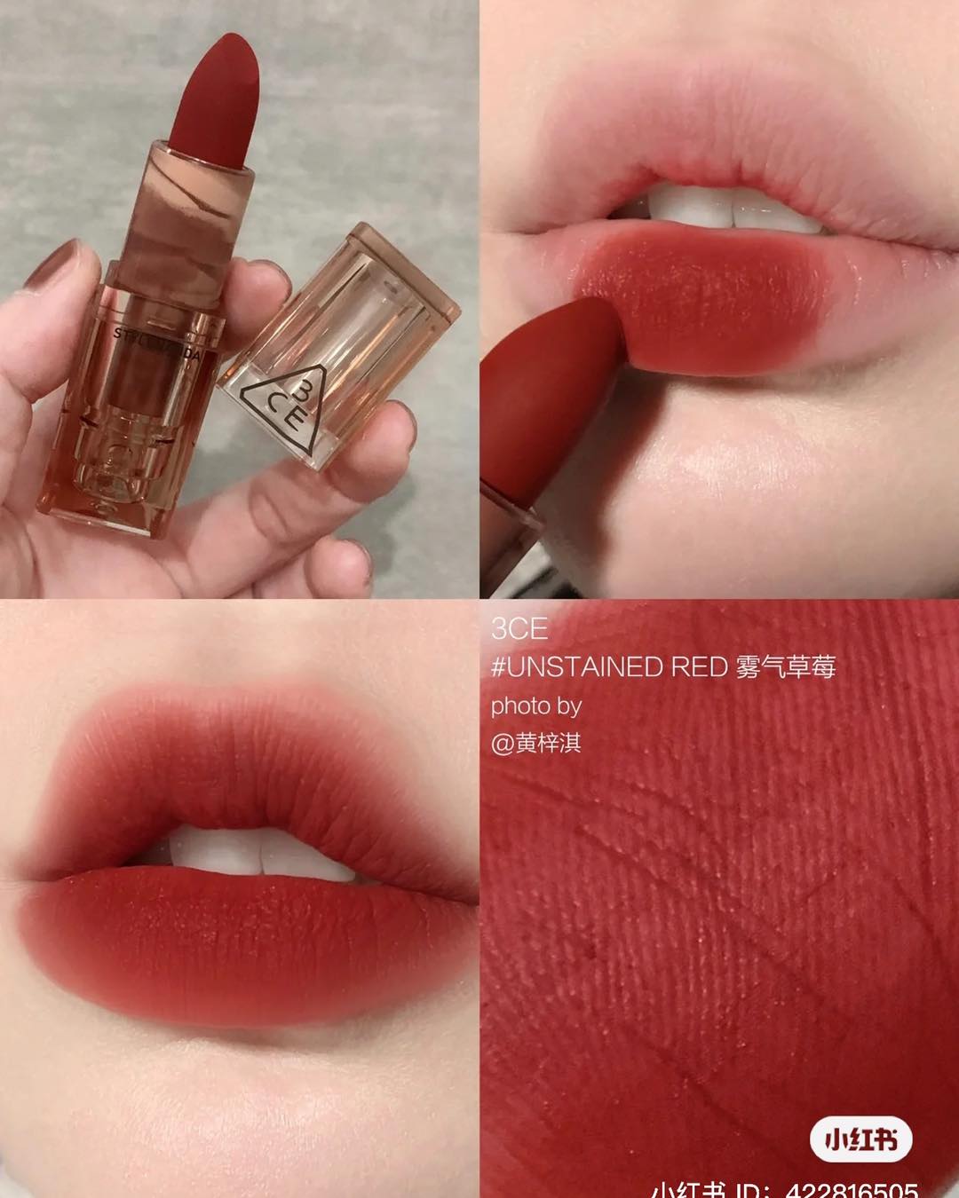 - Unstained Red: vẫn là gam đỏ nhưng tươi hơn, không hề kén lớp make-up, chỉ cần kẻ mày, xoa chút kem chống nắng nâng tone và đánh một lớp son 3CE là đã quá tự tin gặp gỡ bạn bè.
