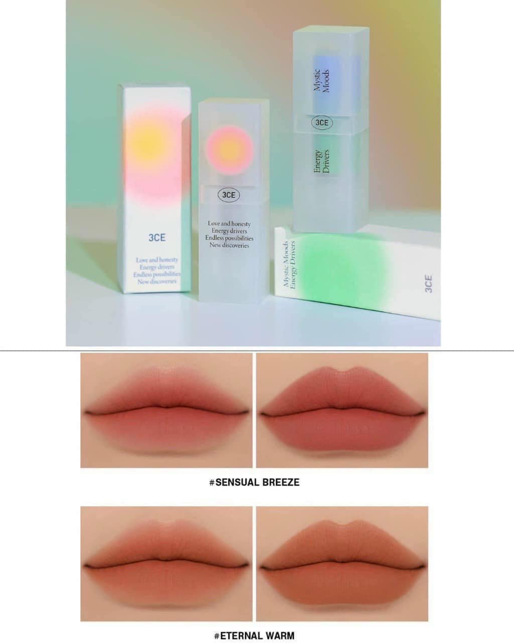 3CE Soft Matte Lipstick Mystic Moods Energy Drivers là dòng son lì đến từ thương hiệu 3CE, có chất son lì, lên môi nhẹ, bám màu tốt, không bị khô, không lộ vân môi, tạo hiệu ứng môi mềm mượt. Finish son môi mờ tự nhiên, lâu trôi. Tiếp nối thành công của mẫu son 3CE Soft Matte Lipstick ra mắt vào năm 2020. Lần này 3CE tiếp tục ra mắt một phiên bản giới hạn cực kỳ mới lạ. Vẫn giữ nguyên vỏ vuông như trước. Nhưng thay vì vỏ trùng với màu son như trước, phiên bản giới hạn này là sự pha trộn hài hòa giữa các màu pestel cực kì điêu luyện và tinh tế.