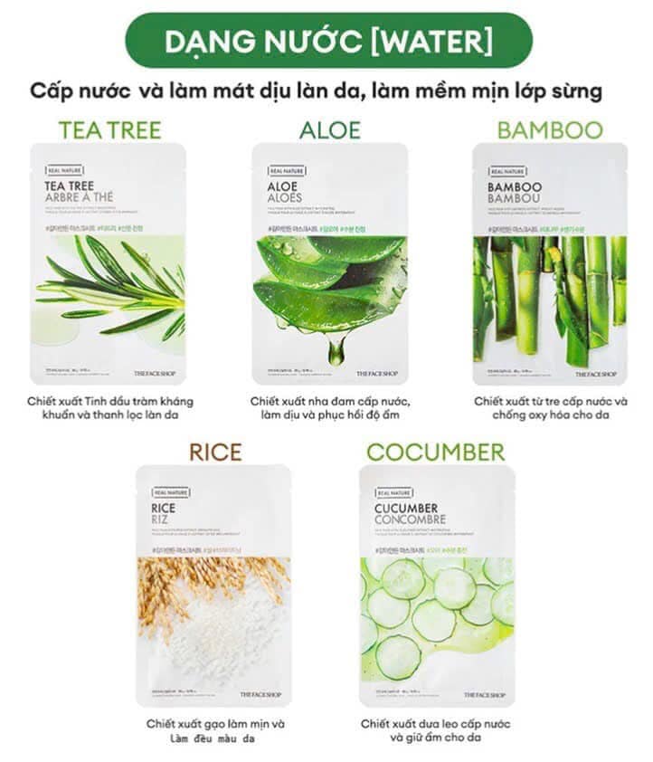 – Mặt nạ thanh lọc da: Giúp kiểm soát dầu, làm sạch da và cấp nước cho da. Bạn có thể chọn mặt nạ chiết xuất mung bean (đậu xanh), Lotus (sen), tea tree (tram trà), Bamboo (tre), cucumber (dưa leo)