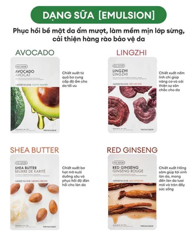 – Mặt nạ dưỡng ẩm: Giúp cung cấp độ ẩm cần thiết cho da, làm dịu da khô và giúp da trở nên mềm mịn, sáng hơn. Bạn có thể chọn mặt nạ chiết xuất mật ong, olive, Avocado (bơ), shea butter (bơ hạt mỡ), potato (khoai tây).