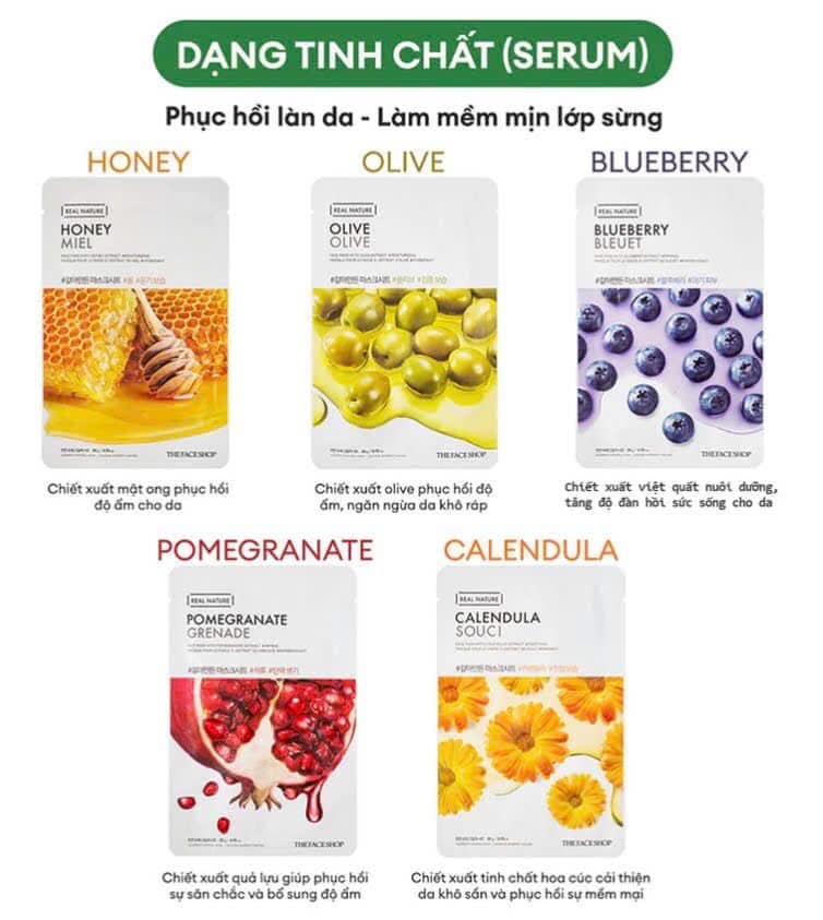 – Mặt nạ tái tạo da: Có tác dụng giúp da phục hồi nhanh chóng sau khi bị tổn thương, giúp da trở nên săn chắc, đều màu hơn. Bạn có thể chọn mặt nạ chiết xuất blueberry (việt quất), pomegranate (lựu đỏ), Calendula (hoa cúc),