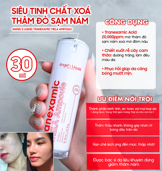 Siêu Tinh Chất Xoá Thâm Đỏ, Mờ Sạm Nám Angel’s Liquid Tranexamic Mela Ampoule là tinh chất đến từ thương hiệu Angel’s Liquid giúp mờ nám chuyên sâu, chống lại dấu hiệu lão hóa sớm của làn da, làm đầy các nếp nhăn hiệu quả, kích thích sản sinh collagen, tăng cường độ đàn hồi cho da gấp 3 lần. Đặc biệt, giúp dưỡng trắng, đều màu da tối ưu. Ngoài ra, làm mờ các dấu hiệu thâm nám trong quá trình mang thai. Duy trì cho bạn một làn da trắng khoẻ như kim cương