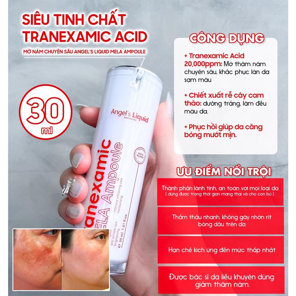 Siêu Tinh Chất Xoá Thâm Đỏ, Mờ Sạm Nám Angel’s Liquid Tranexamic Mela Ampoule là tinh chất đến từ thương hiệu Angel’s Liquid giúp mờ nám chuyên sâu, chống lại dấu hiệu lão hóa sớm của làn da, làm đầy các nếp nhăn hiệu quả, kích thích sản sinh collagen, tăng cường độ đàn hồi cho da gấp 3 lần. Đặc biệt, giúp dưỡng trắng, đều màu da tối ưu. Ngoài ra, làm mờ các dấu hiệu thâm nám trong quá trình mang thai. Duy trì cho bạn một làn da trắng khoẻ như kim cương